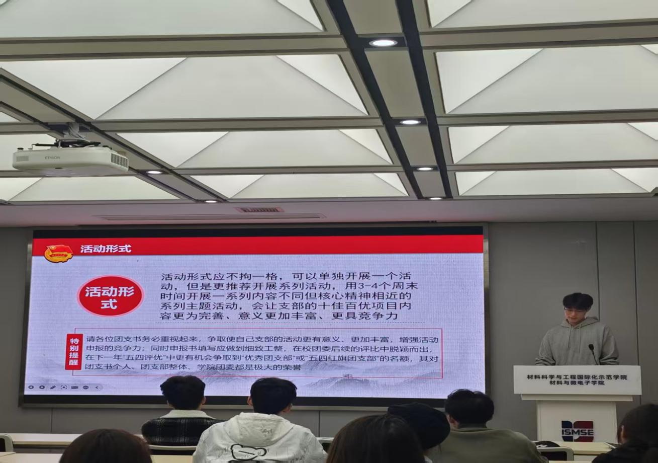 培训会上,杨宇恒首先就“十佳百优”评比活动的定义与深远意义进行了深入阐释。他指出,“十佳百优”不仅是衡量基层团组织活力的重要标尺,更是激发团支部工作热情、展现团员青年风采的关键平台。杨部长强调,各位团支书作为团支部的“领头雁”,必须深刻理解此项工作的重要性,切实增强责任感和使命感,将创建“十佳百优”团支部作为学年工作的核心目标,以此带动支部全面发展。